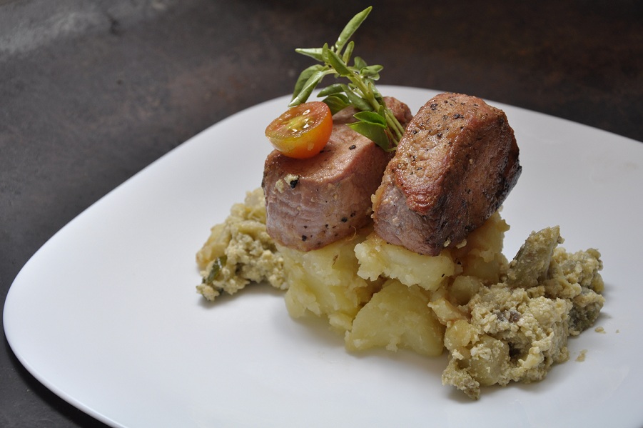 empere bem a carne com sal, pimenta do reino e azeite. Coloque em uma frigideira quente e sele bem todos os lados para os sucos da carne não saírem. Depois coloque no forno por uns 10 minutos a 200 graus ou até a carne ficar no ponto. Reserve. Descasque e coloque as batatas para cozinhar. Quando elas estiverem quase prontas, retire elas da panela e amasse um pouco, em seguida coloque as mesmas em uma frigideira com azeite e frite-as dos dois lados. Reserve. Para o jiló, descasque os mesmos e corte em quatro pedaços colocando todos em uma panela com azeite de oliva. Tempere o jiló com sal e pimenta do reino. Quando o jiló estiver molinho, retire do fogo e adicione os ovos, misturando tudo. Pronto! Disponha as batatas no centro do prato, coloque os medalhões de carne por cima e o jiló nos lados. Finalize com um tomate cereja cortado ao meio e com uma flor de manjericão!