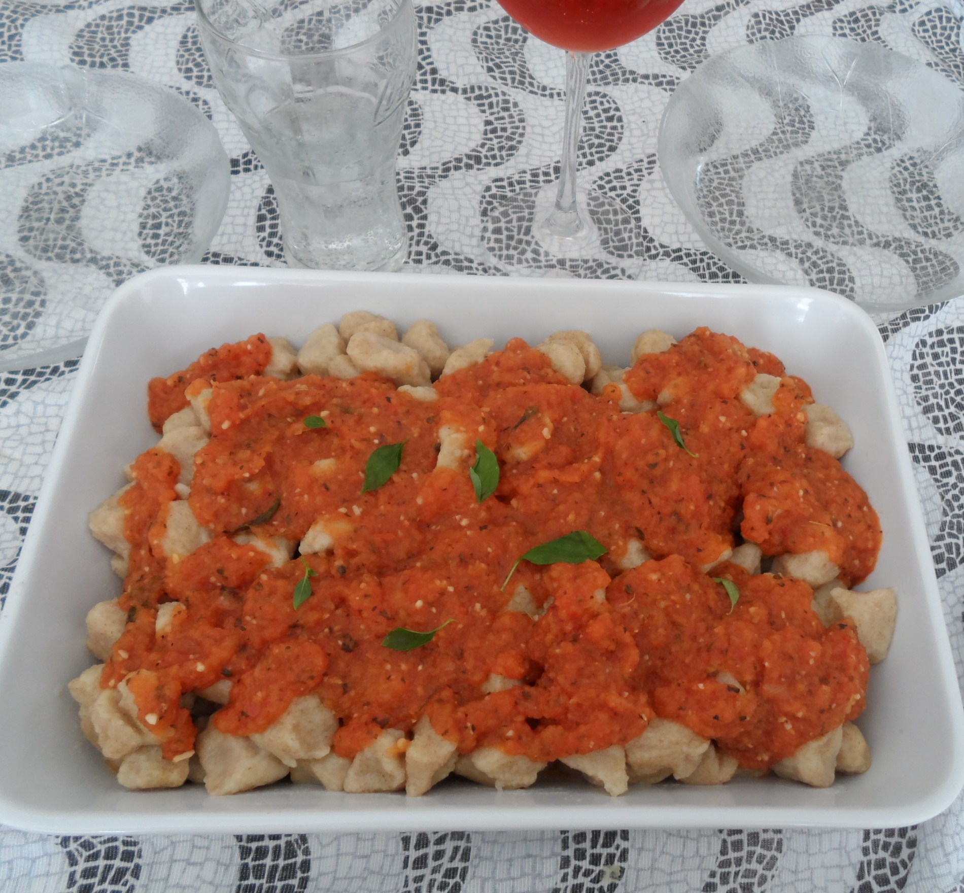 Cozinhe as batatas com casca, ainda quentes passe-as pelo espremedor. Após junte as farinhas, o sal, a pimenta e noz moscada. Amasse delicadamente até que fique muito bem misturado. Despeje a massa sobre uma bancada polvilhada com farinha e modele rolinhos, corte-os em mais ou menos 2 cm cada e achate com um garfo. Cozinhe a massa em um recipiente com bastante água e sal. Se encontra cozido quando sobe a superfície estão prontos. Retire-os deixando escorrer bem. Sirva com o molho de sua preferência.