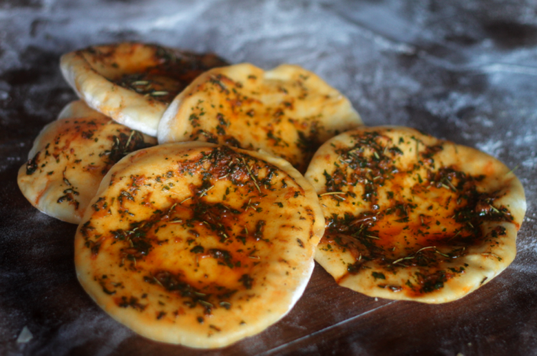 Misturar o fermento com o açúcar e ½ xícara de água morna em uma tigela. Esperar alguns minutos até que espume. Em outra tigela, misturar a farinha, o sal e fazer um buraco ao centro, onde vai a mistura do fermento e o azeite de oliva. Ir adicionando uma xícara da água morna aos poucos, misturando até que a massa não grude mais nos dedos. Levar a uma superfície enfarinhada e sovar por cerca de 10 minutos. Deixar crescer por meia hora em um lugar quente da cozinha. A massa deve dobrar de tamanho. Dividir a massa em porções do tamanho de uma bola de ping pong e abrir com a ajuda de um rolo até ficarem com a espessura de 1 cm. Deixar crescer por mais 20 minutos enquanto pré aquece o forno em potência máxima. Assar por cerca de sete minutos cada.