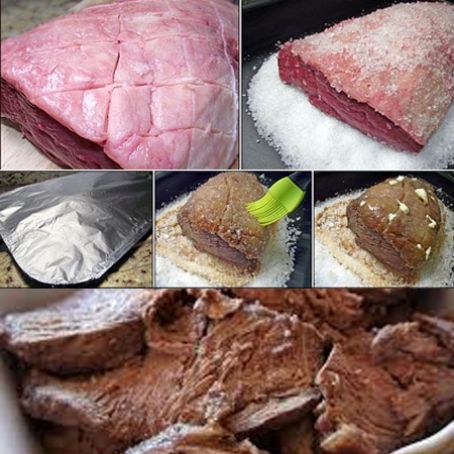 retire do forno, bata na carne para tirar o sal, com a ajuda de um pincel, espalhe pedacinhos de manteiga e volte para o forno sem o papel até dourar a gordura (por volta de 30 minutos)