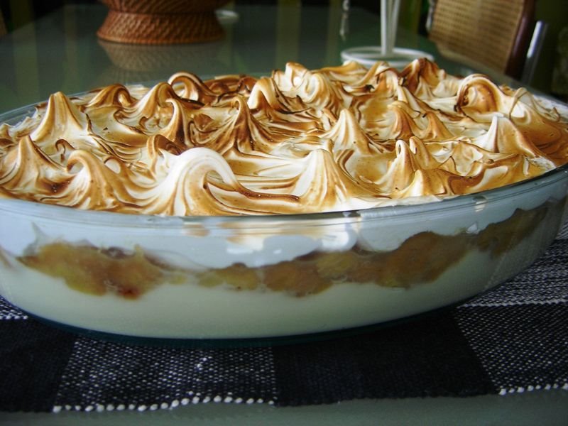 coloque o creme reservado por cima da calda de caramelo e o merengue por cima do creme