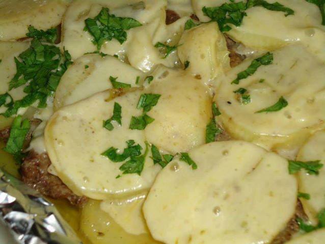 Corte as batatas em rodelas médias, em uma forma forrada com papel alumínio (bem grande, pois depois vai fechar a forma), espalhe um pouco de azeite pela forma e coloque uma camada de batatas, e tempere com sal e pimenta, e um pouco do alho, coloque os bifes por cima das batatas, mais alho e regue com um pouco de azeite, faça outra camada de batatas, tempere com sal pimenta e o alho e regue com mais azeite