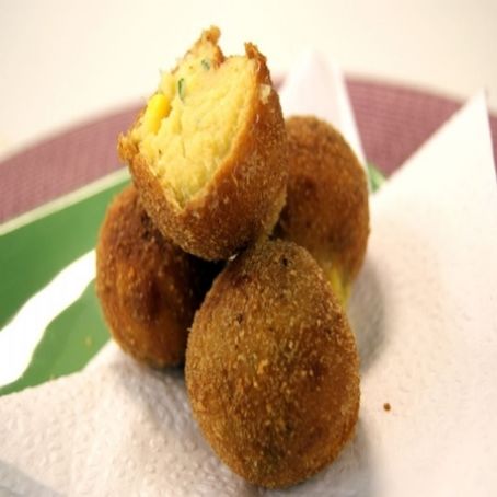 Bata no liquidificador 1 lata e meia de milho, os ovos, o leite a manteiga, o queijo ralado, até desmanchar o milho. Aqueça uma panela, e coloque esse liquido para aquecer junto com o restante do milho verde em lata inteiro o cheiro verde e acerte o sal se precisar, quando estiver borbulhando acrescente a farinha de trigo de uma só vez e mexa bem até que a massa desgrude da panela, e que a massa cozinhe um pouco. Enrole os bolinhos e coloque um pedaço de mussarela em cubos, passe no ovo e na farinha de rosca e frite em óleo bem quente.