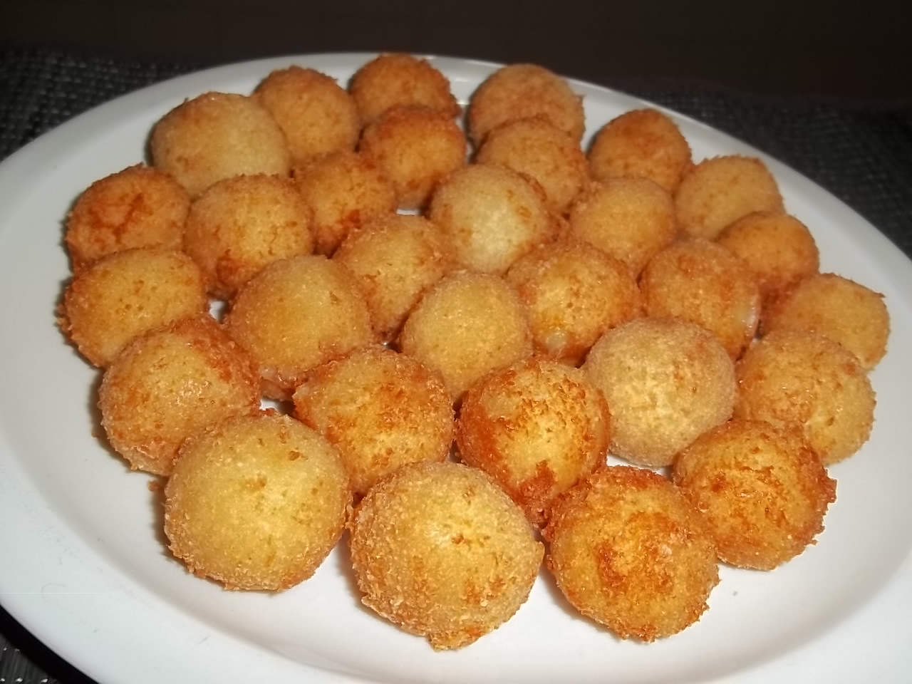Faça bolinhas pequenas com a massa e recheie. Passe as bolinhas na farinha de trigo, na clara e por último na farinha de rosca. Frite em óleo quente até que fiquem douradas. Sirva quente.