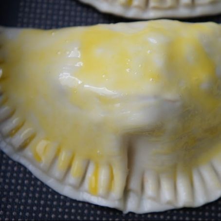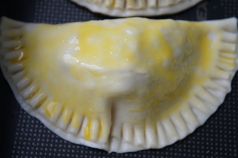 Corte em circulos,recheio os pasteis,sele com a clara e pintele com a gema.