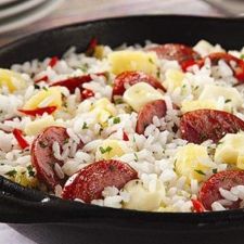 Na mesma panela, adicione o extrato de tomate, o arroz e refogue por 2 minutos.