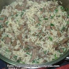 - 3 xícaras de arroz, 1 litro de água fervente, 1 dente de alho amassado, 2 colheres(sopa) de óleo, 1 linguiça calabresa(fininha), 200 g de bacon, 1 cebola, cheiro verde e sal a gosto.