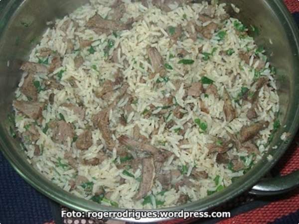 Acrescente as duas xícaras de arroz, e a salsinha e cebolinha picadas e deixe cozinhar até o arroz ficar pronto. Acrescente água se necessário para cozer o arroz.
