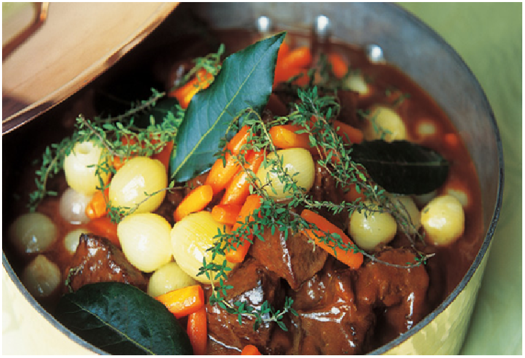 6. Aqueça a carne e junte a cenoura e a cebola. Decore com o louro e o tomilho. Sirva.