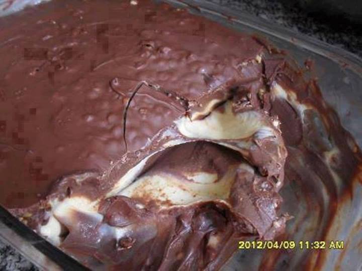 Separe 1/3 dessa mistura e no restante coloque o chocolate meio amargo derretido e ficará um creme escuro.