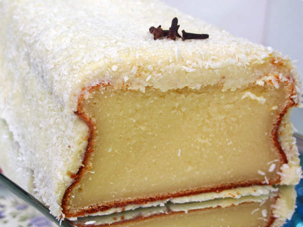 Em um liquidificador coloque 1 lata de leite condensado, 1 lata de leite, 1 lata de leite de coco, 3 ovos, 1 lata de farinha de trigo, ½ lata de açúcar, 3 colheres (sopa) de margarina e 1 ¼ xícara (chá) de coco ralado seco e bata bem até formar uma mistura homogênea.
