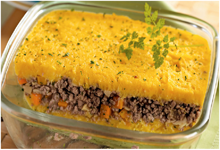 Em um recipiente misture a mandioquinha, o ovo, a margarina e a farinha de trigo. Aqueça o forno a 200ºC. Em um refratário alterne camadas de mandioquinha e carne. Leve ao forno durante uns 20 minutos. Sirva o prato em seguida.