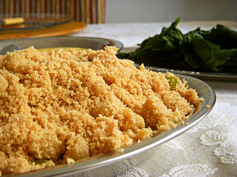Se gosta de farofa úmida, não coloque muita farinha.