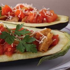 Retire a berinjela do forno e,sobre cada uma delas,coloque uma porção de tomate e mussarela.Regue com o restante do azeite e leve ao forno,novamente,até a mussarela derreter