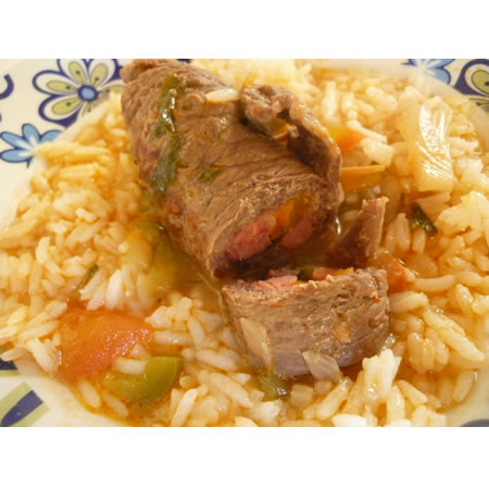 Em um refratário coloque os pedaços de carne e tempere com alho e sal (reserve). corte os temêros para o molho. Depois coloque a cenoura, a linguicinha, a cebolinha verde e o queijo sobre o pedaço de carne e enrole-o como se tivesse preparando a panqueca. Prenda-o com 2 palitos de dente para que na hora da fervura não se abra a carne. Em seguida coloque os enroladinhos de carne na panela e deixe fritar um pouquinho e coloque a cebola picada, o tomate , o caldo kinnor e 2 colheres de molho de tomate. Cubra com água os enroladinhos e deixe-os conzinhar no molho por uma hora ou até estiver bem cozida a carne e a cenoura.