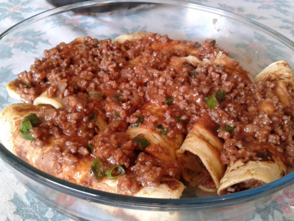 Monte as panquecas num refratário, colocando uma porção de carne sobre metade da panqueca de forma que dê para enrola-las. Vá arrumando as panquecas lado a lado até acabar a massa.