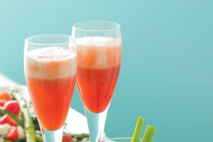 Peneire o suco para retirar as sementes (dos morangos). Coloque numa jarra e adicone a água com gás. Sirva.