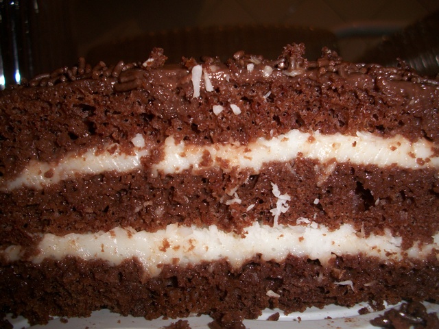 Jogue por cima da massa ja assada, derreta o chocolate em banho maria e adicione o creme de leite, mexa bem e jogue em cima do beijinho, decore com o coco ralado e deixe na geladeira por no minimo 2 horas.