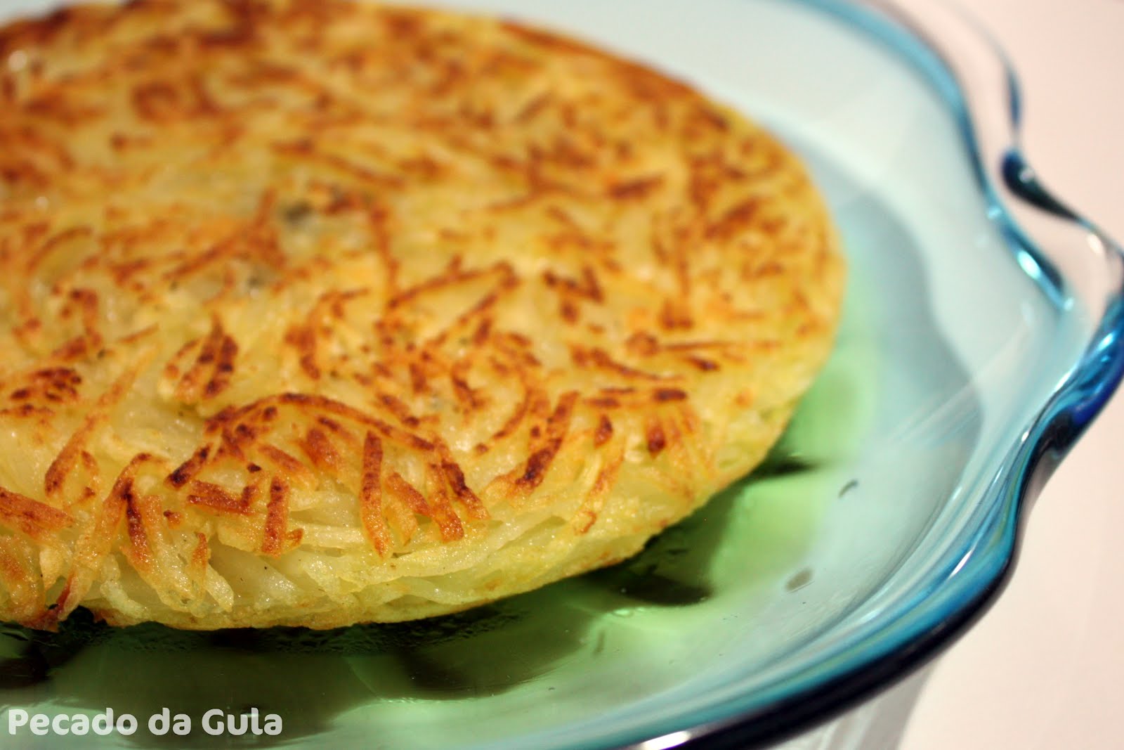Coloque a batata ralada, o suficiente para cobrir o fundo da frigideira, sempre humedecendo as mãos na água com sal (facilita o manuseio da batata e salga ao mesmo tempo).