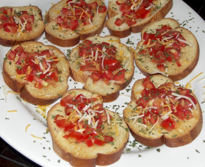 Corte o pão em rodelas e cubra com alho, azeite, queijo ralado e o tomate.