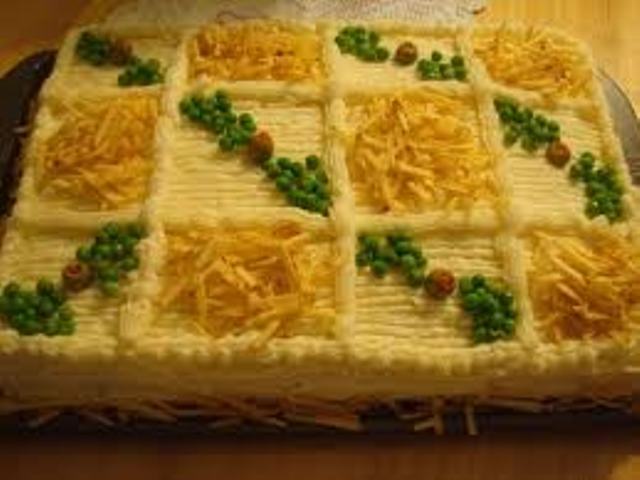 Coloque a primeira camada de pão de forma bem apertadinho, passe um pouquinho de maionese, coloque metade do recheio e metade da cenoura ralada