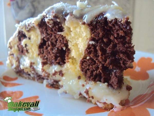 Em seguida, coloque metade da massa em uma forma untada e enfarinhada, e a outra metade coloque o chocolate em pó e misture, despeje o restante da massa com chocolate