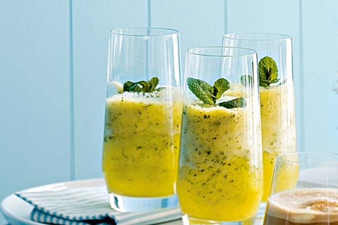 Despeje em copos. Decore com raminhos de hortelã e sirva.