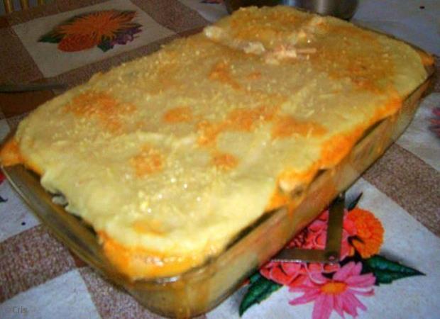 Unte o pirex com margarina, polvilhe farinha de rosca, coloque metade da massa, recheio, queijo mussarela e outra porção de massa