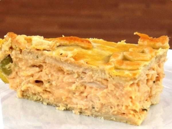 6°- Numa assadeira forre o fundo e as laterais com ¾ de massa (reservada acima), coloque o creme de frango, distribua 15 azeitonas verdes sem caroço e cubra com ¼ de massa. Pincele 1 gema e leve ao forno alto pré-aquecido a 250°C por +/- 40 minutos. Retire do forno e sirva em seguida.