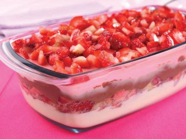 Em uma travessa despeje o creme branco no fundo e por cima o creme com chocolate, decore com morangos como preferir