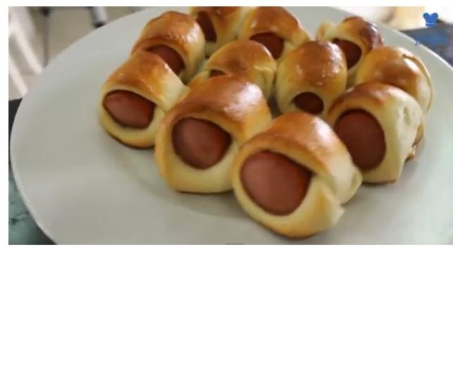 Abrir a massa com um rolo e cortar a massa em triângulos. Coloca o pedaço de salsicha no meio e enrola. Passar um ovo batido por cima de cada salsicha com um pincel e levar para o forno aquecido a 250º por aproximadamente 15 minutos.