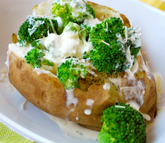Abra as batatas ao meio (retire um pouco da polpa), recheie com o molho e sirva quente.