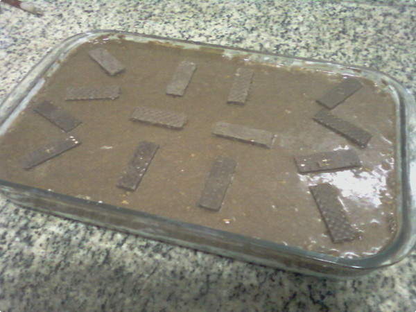 Em uma outra vasilha, derreta chocolate misture com o creme de leite, as claras em neve e as colheres de açúcar.
