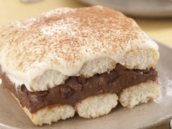 Em uma panela, misture o Leite com metade do Leite , as gemas peneiradas, o amido de milho e três colheres (sopa) do Chocolate em Pó. Leve ao fogo baixo, mexendo sempre, até adquirir consistência cremosa. Reserve. Em uma batedeira, bata as claras em neve, junte o açúcar, aos poucos, sem parar de bater. Misture delicadamente o Creme de Leite e reserve. Umedeça os biscoitos na mistura de licor de cacau com o Leite restante. Forre com parte dos biscoitos umedecidos uma forma retangular (20 x 30 cm), despeje o creme de chocolate reservado, o Chocolate Meio Amargo picado, os biscoitos restantes e, por último, a cobertura de claras reservada. Leve à geladeira por cerca de 4 horas. No momento de servir, peneire o restante do Chocolate em Pó sobre a superfície