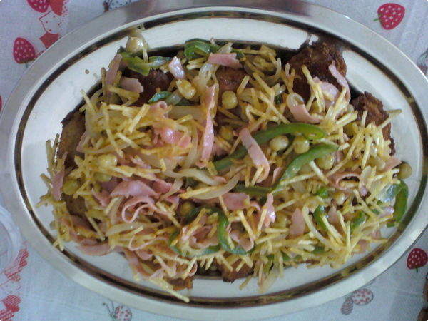 Em uma frigideira alta, coloque a margarina e a cebola e frite levemente adicionando o pimentão e o presunto em seguida a batata e as ervilhas.