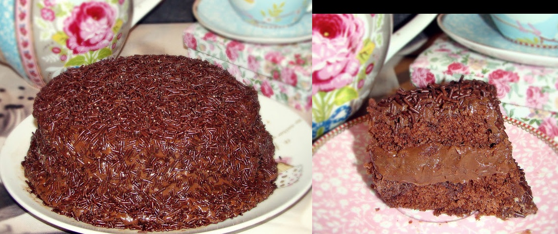 Coloque metade do bolo sobre um prato, fure-o com auxílio de um garfo e molhe-o com a calda. Recheie o bolo com a metade do recheio. Coloque a outra metade do bolo por cima do recheio e molhe-o com a calda. Cubra o bolo com o restante do recheio e, por último, enfeite-o com bastante chocolate granulado.