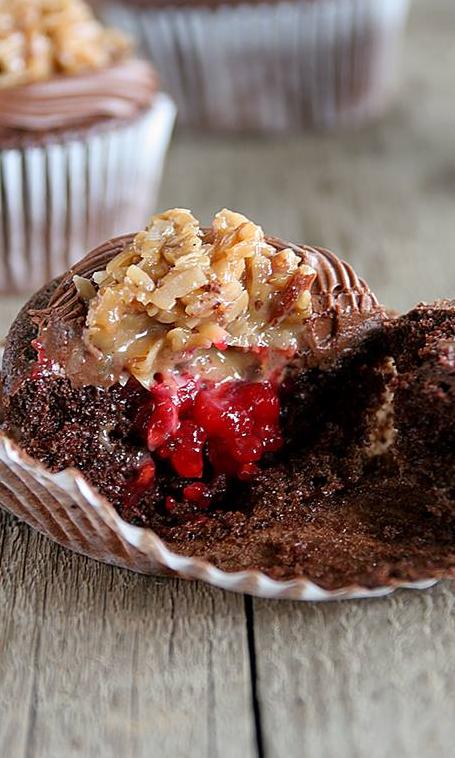 Corte um cone para fora do topo de cada cupcake. Encha o cupcake com recheio de framboesa. Tubo uma borda da cobertura de chocolate ao redor da borda de cada cupcake. Encha o centro com um monte de cobertura de chocolate alemão.