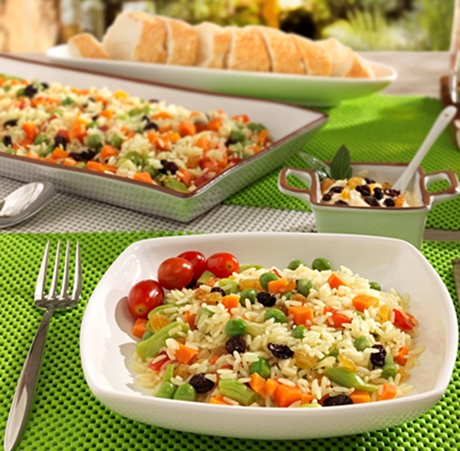 Solte o arroz com um garfo, adicione o presunto, a ervilha e a batata, misturando bem. Sirva.