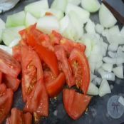 Cortamos tomates (2 grandes) e cebolas (2 grandes) em pedaços grandes.
