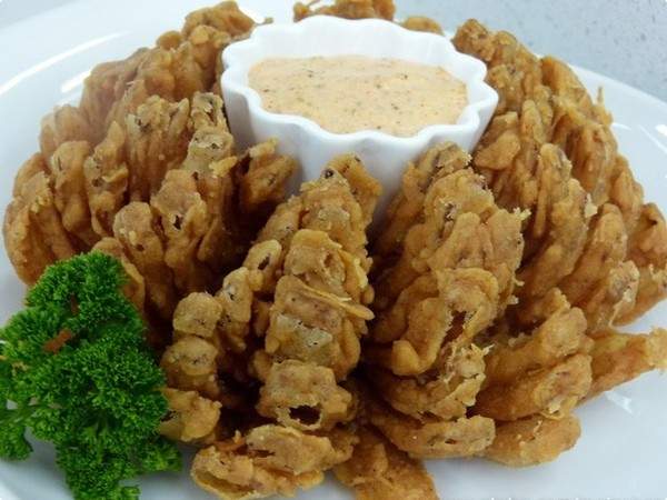 Coloque a cebola com a parte cortada para baixo (para ficar firme) e com uma faca bem afiada corte tiras verticais, começando pela parte da raiz, sem desprende-las. Faça esses cortes em toda a cebola, mas sem chegar até o miolo dela (para não despedaçar). Depois disto deixe-as de molho em água gelada e com gelo, dentro da geladeira com um peso por 30 minutos. Retire o peso, vire a cebola e deixe por + 15 minutos. Depois, escorra as cebolas