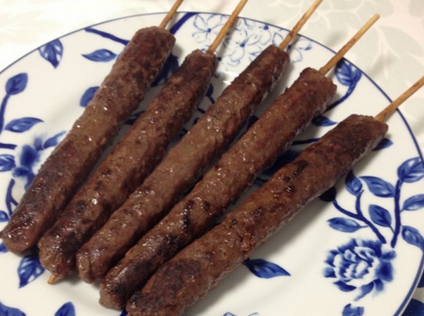 No palito de churrasco, coloque porções de cerca de 20 g e modele como uma salsicha fina.Cubra com a carne moída temperada.Grelhe em chapa ou grelha, previamente untada com azeite.