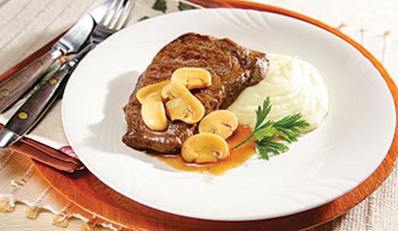 Adicione o caldo de carne, o sal e os champignons. Cozinhe por cerca de 5 minutos ou até o molho engrossar. Sirva sobre os bifes.