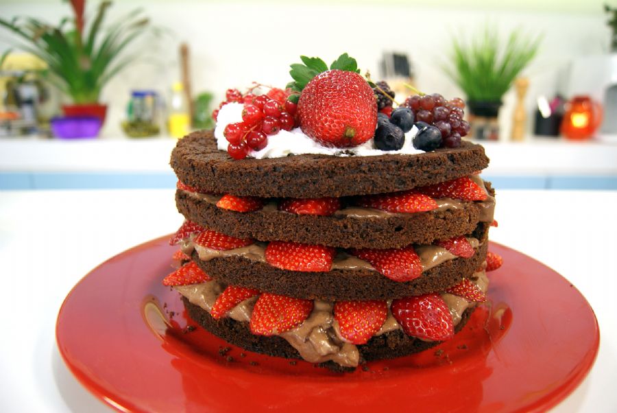 Para a massa, peneire a farinha de trigo, a farinha de amêndoas, o sal e o fermento. Reserve. Bata na batedeira as gemas e o açúcar até ficar um creme fofo. Acrescente a manteiga e bata mais um pouco. Adicione o iogurte e sem parar de bater, adicione o cacau em pó e as farinhas misturadas. Agregue as claras em neves misturando delicadamente. Coloque a massa em uma assadeira redonda com 18cm de diâmetro untada e enfarinhada e leve ao forno quente (180º) por aproximadamente 1 hora. Tire do forno, espere amornar, desenforme e corte a parte de cima de cada bolo apenas para ficar bem liso e reto. Divida a massa em 3 partes iguais cortadas na longitudinal. Passe o recheio sobre as camadas do bolo, coloque uma sobre a outra lembrando de acomodar algumas fatias de morango entre elas. Leve para a geladeira por aproximadamente 1 hora. Tire da geladeira, e decore com os morangos.