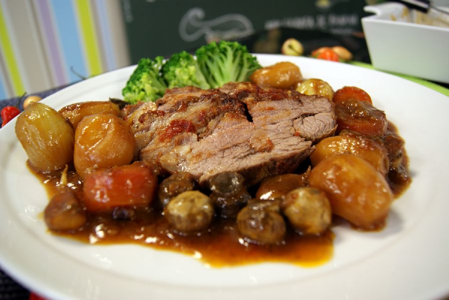 Em uma vasilha, coloque a carne e tempere-a com sal, pimenta, açúcar e shoyu. Aqueça o óleo em uma frigideira e doure a carne, depois transfira para uma assadeira. Sobre a carne, espalhe o extrato de tomate, o creme de cebola e a cerveja preta. Adicione o caldo de costela dissolvido na água fervente, a batata, a cebola, o cogumelo e o alho. Polvilhe sal e pimenta sobre os legumes, cubra com papel alumínio e leve ao forno pré-aquecido. Retire o papel alumínio e asse por mais aproximadamente 10 minutos. Retire do forno e misture os brócolis branqueados.