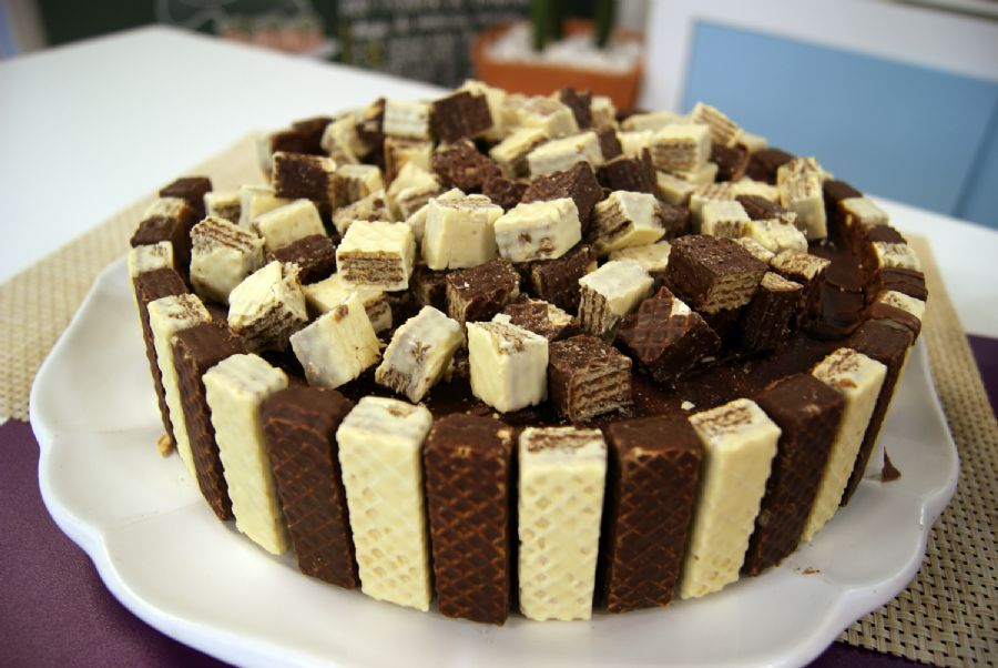 Em um aro com 25 cm de diâmetro forrar com as bolachas Maria. Colocar o creme branco por cima, se quiser colocar outra camada de bolacha cobrir com o creme de chocolate ao leite. Levar a geladeira. Depois de gelado desenformar e "colar" os waffle ao redor intercalando as cores.