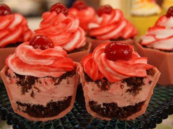 Corte no diâmetro da forma ou esfarele com um garfo a massa e faça camadas de recheio e massa dentro da casquinha de chocolate já pronta. Finalize com a cobertura e decore a gosto.