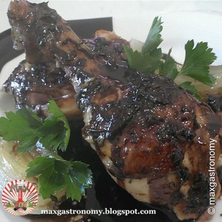 Servir o frango com algumas cebolas assadas e molhar com um pouco do molho do marinado. E cobiri com um pouco de molho de chocovinho por cima.