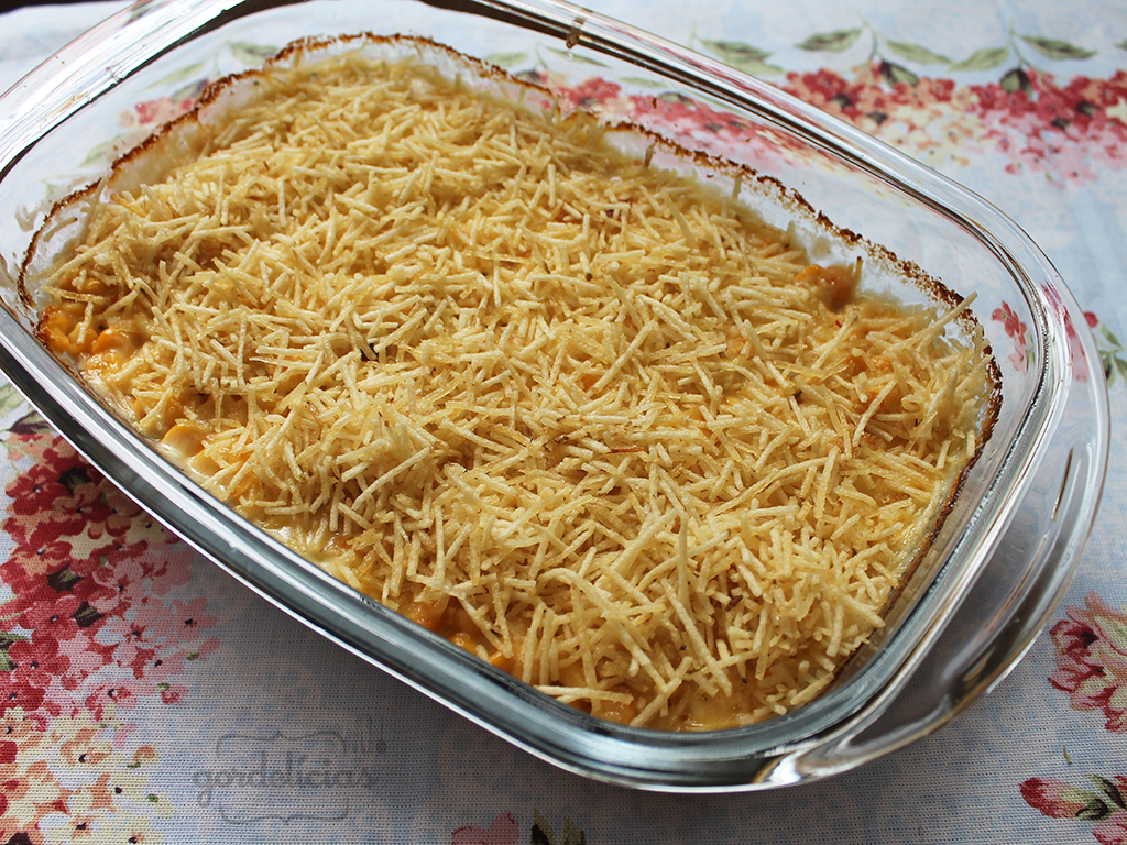 Coloque em um marinex em cima do purê de batatas, acrescente queijo e batata palha.