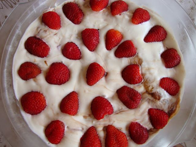Faça camadas de bolacha, creme e os morangos, alternadamente
