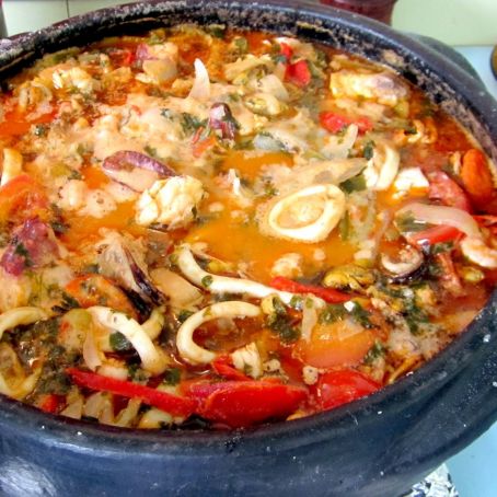 Deixe ferver por 20 minutos, acrescente o camarão e a lula e deixe cozinhar por mais 5 minutos. Por último, acrescente o sal e o peixe.